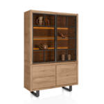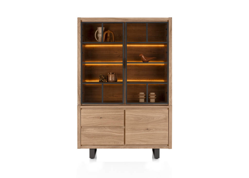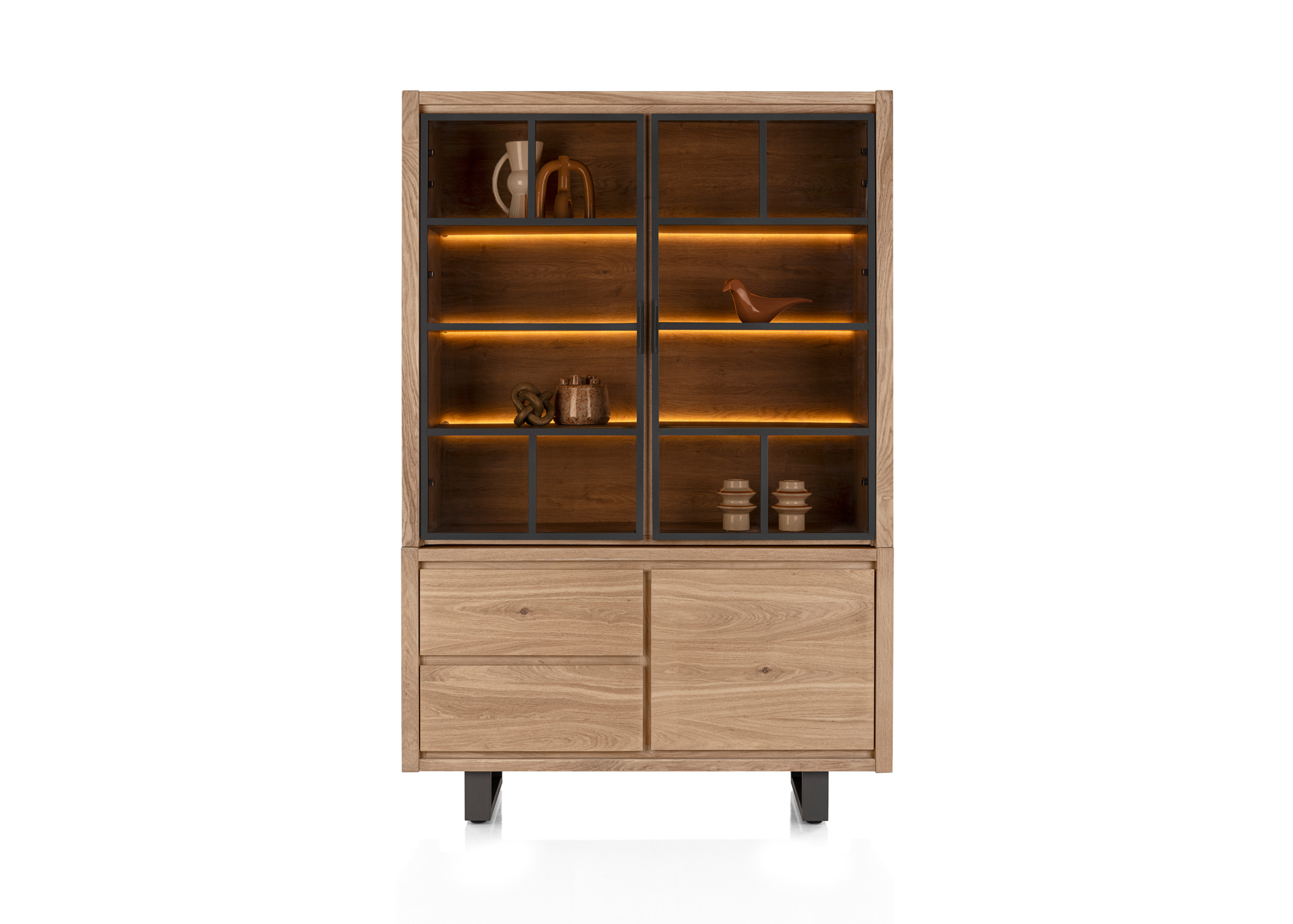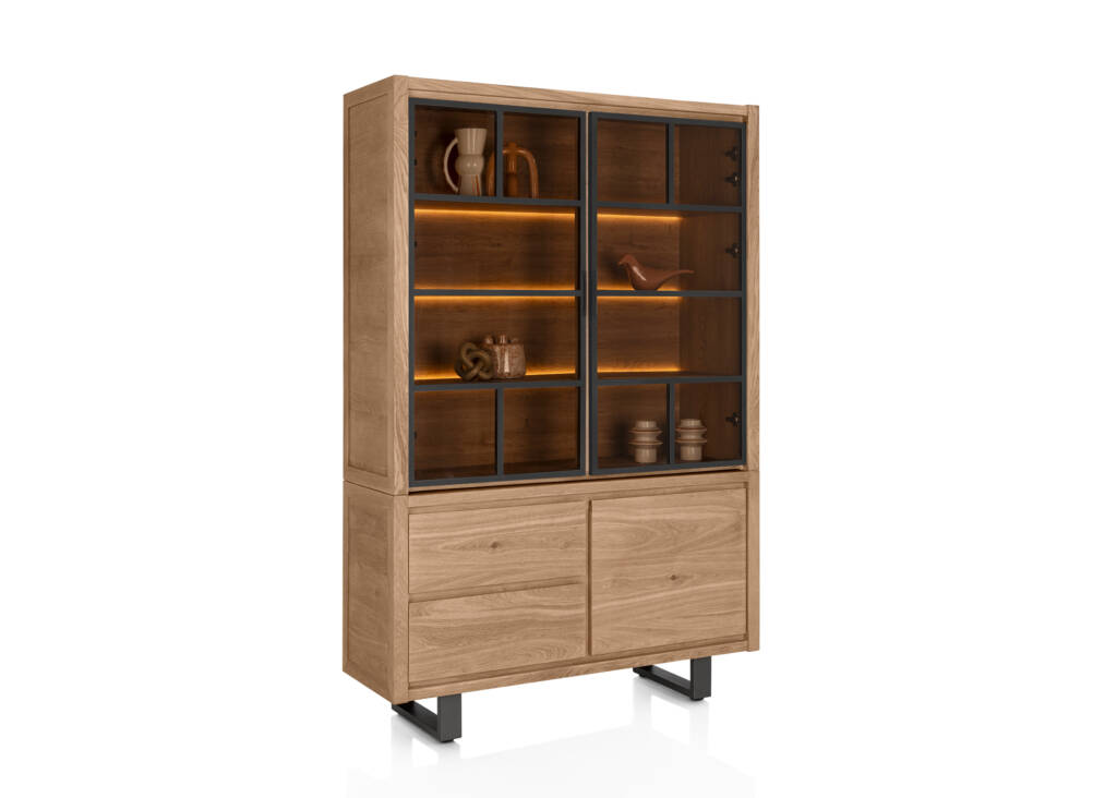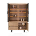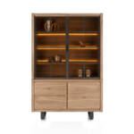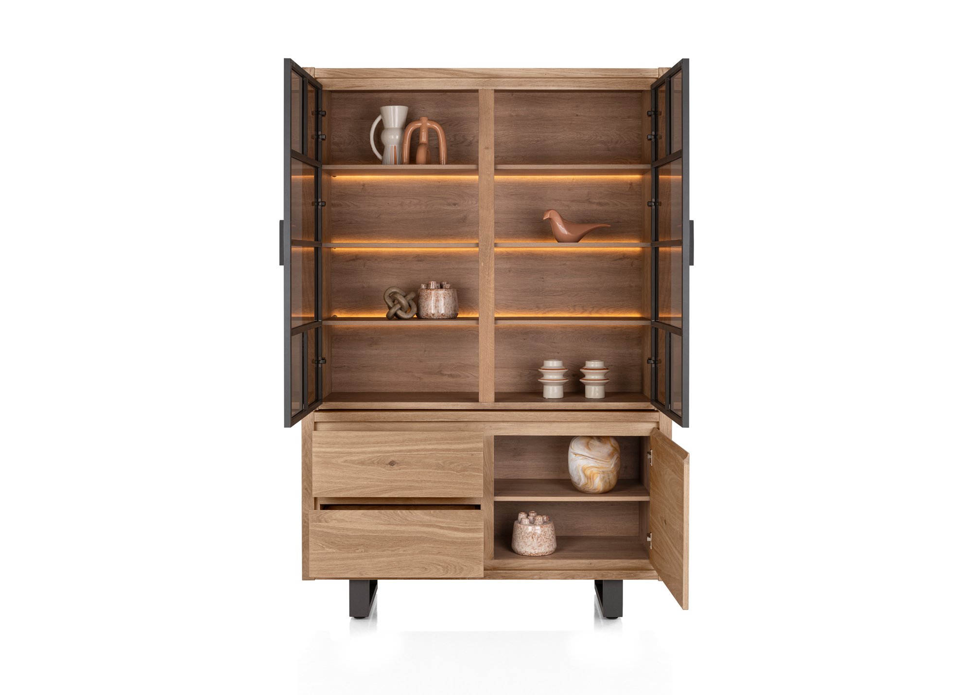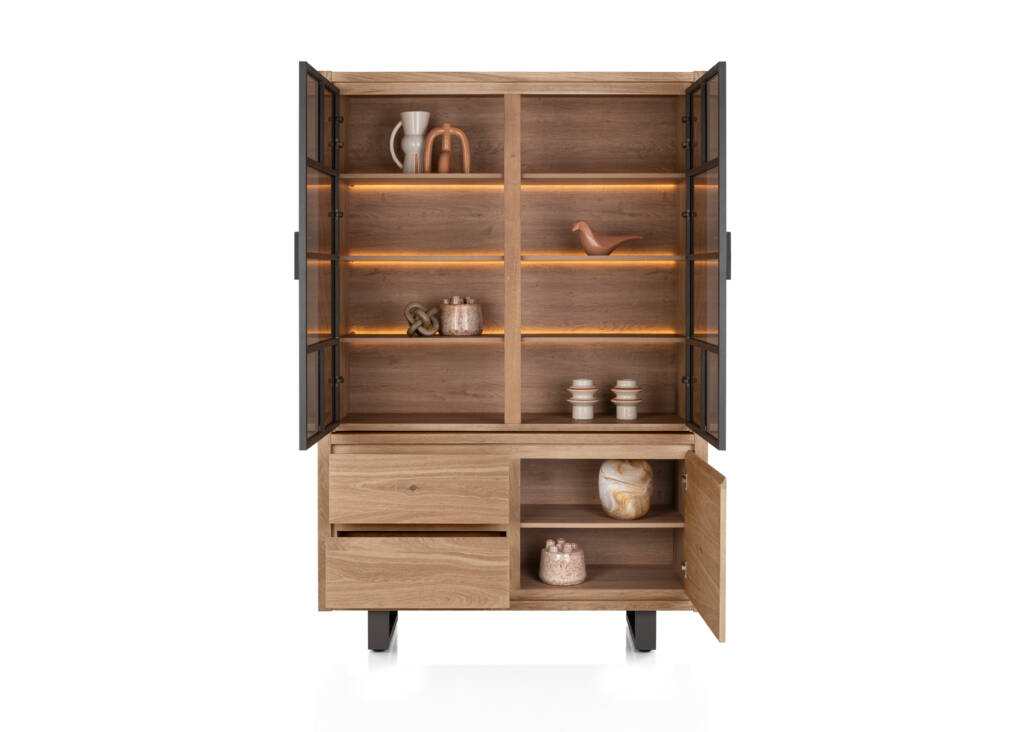 Achter de twee metalen glasdeuren bevindt zich een prachtig displaygedeelte, voorzien van geïntegreerde LED-verlichting. Hierdoor komen glazen, servies of decoratie extra mooi tot hun recht en creëer je eenvoudig een sfeervol accent in je woon- of eetkamer.