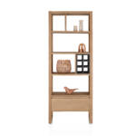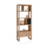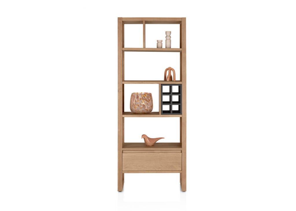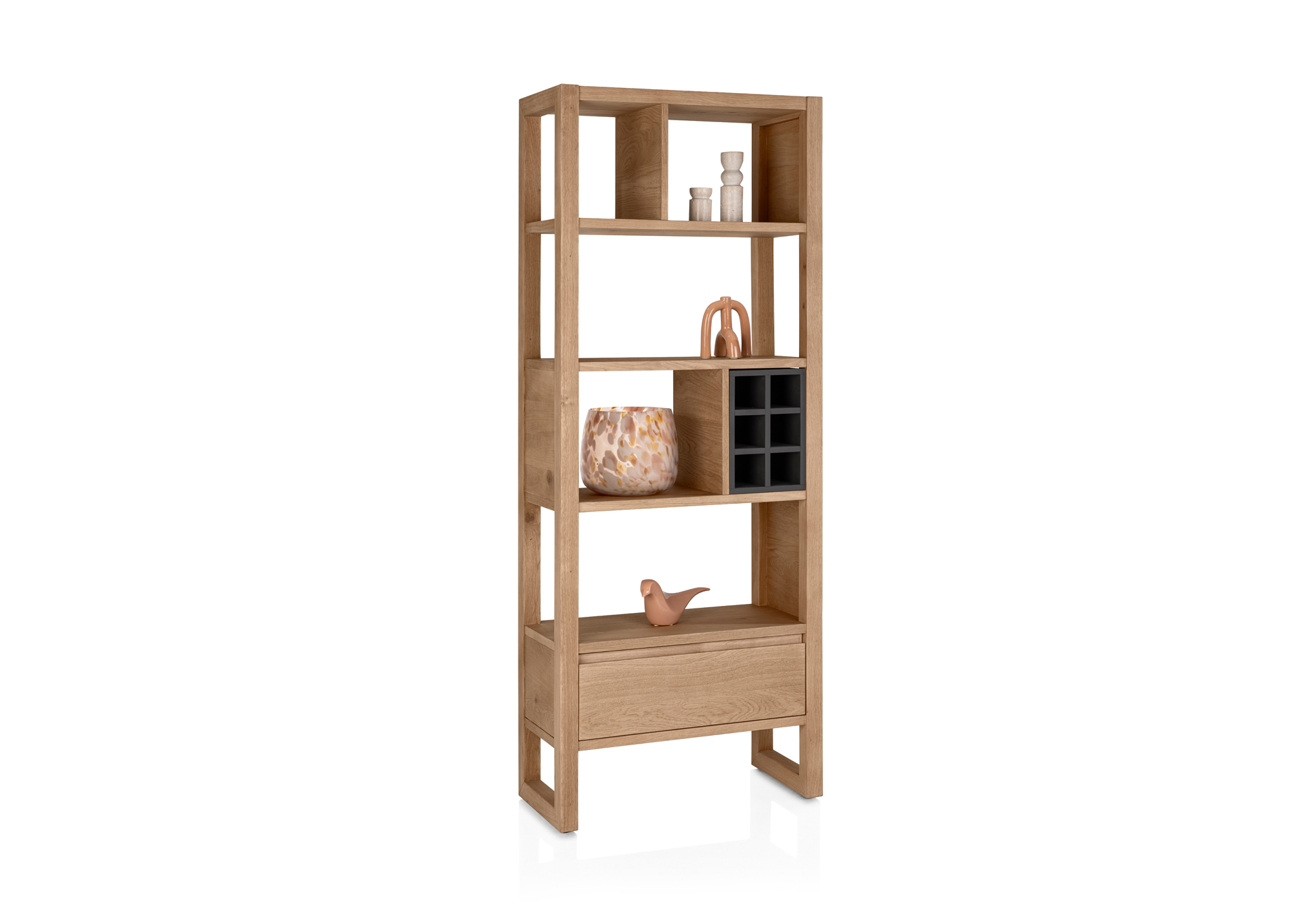Met een hoogte van circa 190 cm en een breedte van 75 cm is de Bonaire roomdivider compact van formaat, maar verrassend veelzijdig in gebruik. Het meubel beschikt over zeven open niches waarin je jouw mooiste accessoires, boeken of decoratie kunt presenteren. Daarnaast zijn er zes speciaal ontworpen wijnvakken, perfect om je favoriete flessen stijlvol op te bergen. De praktische lade, die aan beide zijden te openen is, maakt dit meubel extra functioneel en ideaal voor dagelijks gebruik.