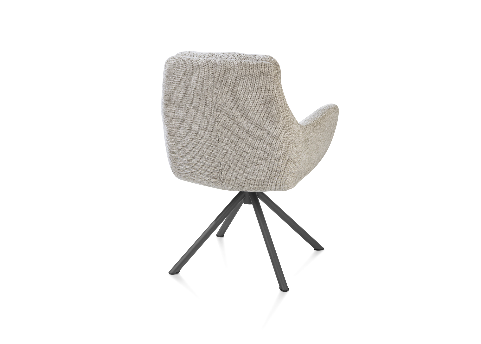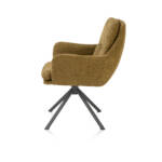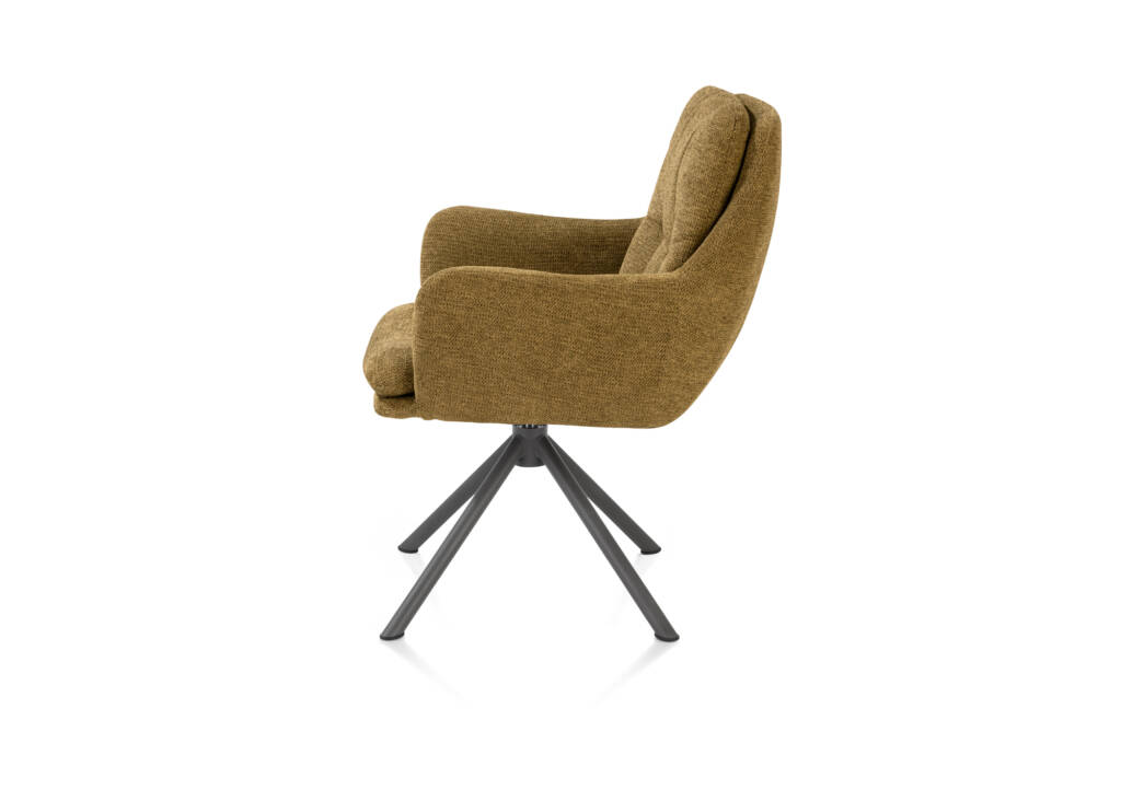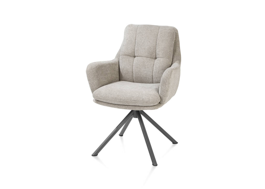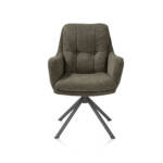 De Madelaine armstoel is een stijlvolle en comfortabele toevoeging aan iedere eethoek. Deze armstoel uit de Happy@Home collectie combineert een modern design met praktisch gebruiksgemak en nodigt uit tot lange, gezellige avonden aan tafel. Dankzij de comfortabele armleuningen en de prettige zit ervaar je direct ontspanning zodra je plaatsneemt. De zitting van de Madelaine is draaibaar en voorzien van een handige terugdraaifunctie. Hierdoor draait de stoel automatisch terug naar zijn oorspronkelijke positie, wat zorgt voor een nette en opgeruimde uitstraling rondom de eettafel. De zitting rust op een stevige metalen kruispoot in de kleur grafiet, die niet alleen stabiliteit biedt, maar ook perfect past bij de moderne uitstraling van de stoel. De bekleding in stof Vada geeft de Madelaine een warme en uitnodigende look. Deze fijne platweefstof met een subtiel haaks patroon voelt prettig aan en is geschikt voor dagelijks gebruik. De armstoel is verkrijgbaar in drie sfeervolle kleuren: mosgroen, beige en oker. Zo kies je eenvoudig de tint die het beste aansluit bij jouw interieur. Naast de armstoel is de Madelaine ook verkrijgbaar als eetkamerstoel zonder armleuningen, ideaal om te combineren voor een speels en harmonieus geheel. Kom de Madelaine zelf ervaren bij Klinkenberg Wonen & Slapen en ontdek hoe comfort, design en gebruiksgemak perfect samenkomen in jouw eethoek.