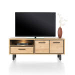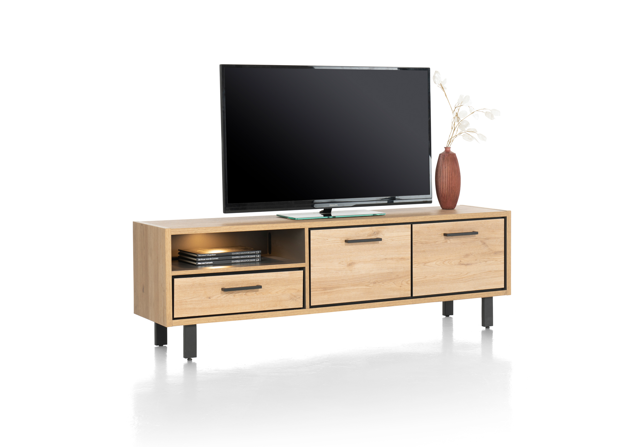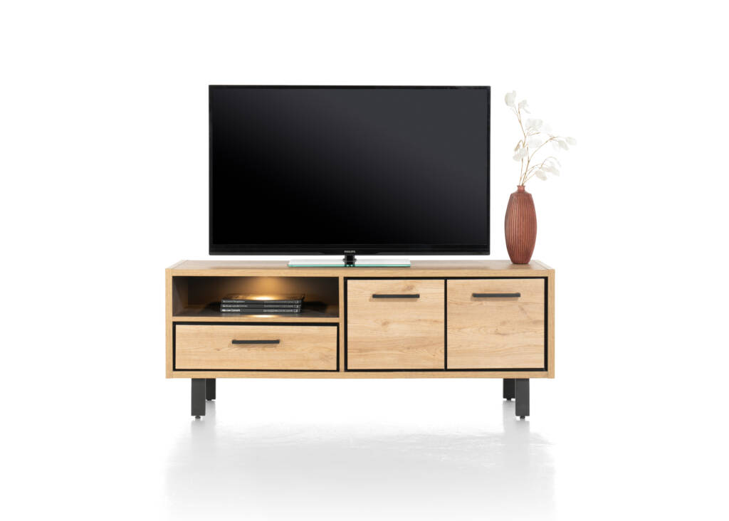 Dit lowboard Ostrava met LED-verlichting is 140 cm breed en is gemaakt van het onderhoudsvriendelijke Primo Laminato. Het lowboard komt uit de Ostrava collectie van Happy@Home en heeft een natuurlijke houtkleur. Deze tv-kast heeft een open vak dat mooi wordt verlicht door ingebouwde LED-verlichting, een grote lade en twee kastdeuren.