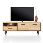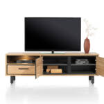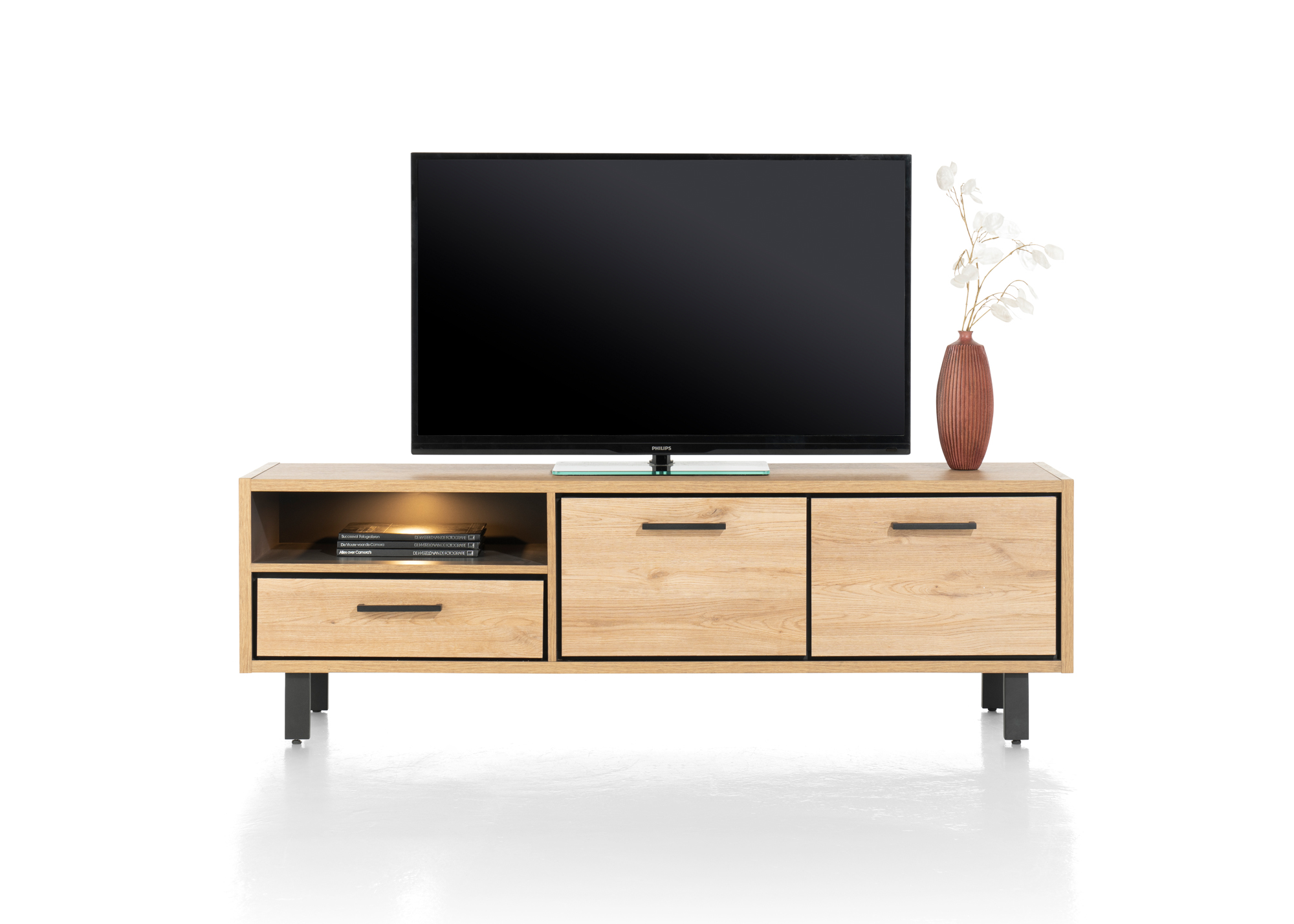 Dit lowboard met LED-verlichting is 170 cm breed en is gemaakt van het onderhoudsvriendelijke Primo Laminato. Het lowboard komt uit de  Ostrava collectie van Happy@Home en heeft een natuurlijke houtkleur. Dit handige opbergmeubel is een ideale tv-kast. Het meubel heeft een open vak dat mooi wordt verlicht door ingebouwde ledverlichting, een grote lade en twee kastdeuren.