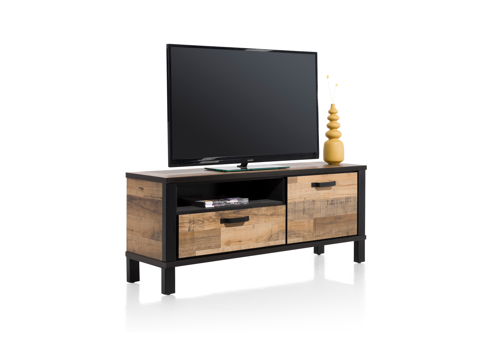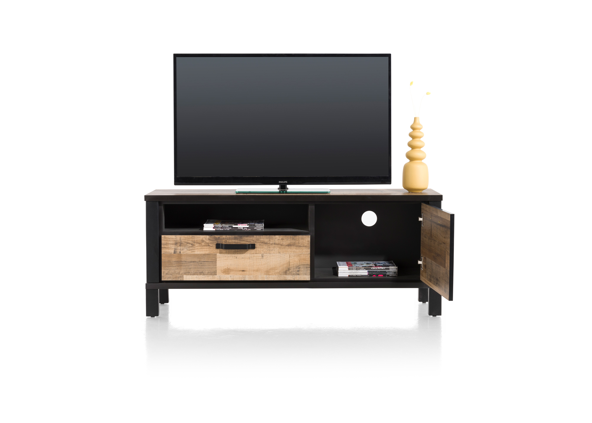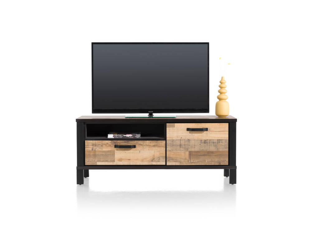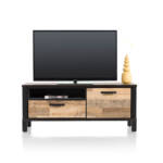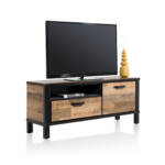 Dit tv-dressoir Sardinie uit de collectie van Happy@Home combineert een stoer uiterlijk met een strak design. Het lowboard is gemaakt van Primo Laminato in de kleur Driftwood. De robuuste uitstraling is vanwege de zwart metalen accenten. Lowboard 140 cm. - 1-deur + 1-lade + 1-niche.