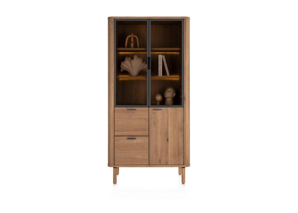 Zoek je een stijlvolle vitrinekast die sfeer en functionaliteit perfect combineert? De Zade vitrinekast uit de Happy@Home collectie is een echte blikvanger in je interieur. Gemaakt van hoogwaardig eikenfineer met stevige melamine accenten, is deze kast duurzaam en onderhoudsvriendelijk. De warme smoked afwerking benadrukt het natuurlijke karakter van het hout en geeft het geheel een moderne, luxe uitstraling. Met twee glazen deuren, één dichte deur en twee handige laden biedt de vitrinekast volop ruimte voor zowel decoratieve items als praktische opberging. Dankzij de geïntegreerde LED-verlichting worden je mooiste accessoires sfeervol uitgelicht – ideaal voor de woonkamer of eetkamer. De Zade vitrinekast is verkrijgbaar bij Klinkenberg Wonen & Slapen en meestal snel leverbaar. Kom langs in onze showroom en ontdek hoe deze kast je interieur verrijkt met stijl, licht en opberggemak.